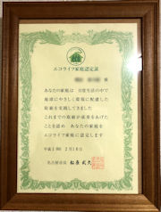 2006年に当時の松原名古屋市長よりエコライフ家庭認定証をいただきました。これは食材をいかに無駄なく利用し食べ物に還元できるかを努力した結果、これらが名古屋市の取り組みに認められ認定されたものです。その他、食べ物以外でもエコライフに通じる取り組みをいくつか認めていただきました。当時この運動はあまり周知されておらず、このような活動をしていても認定された方は極少数だったようです。